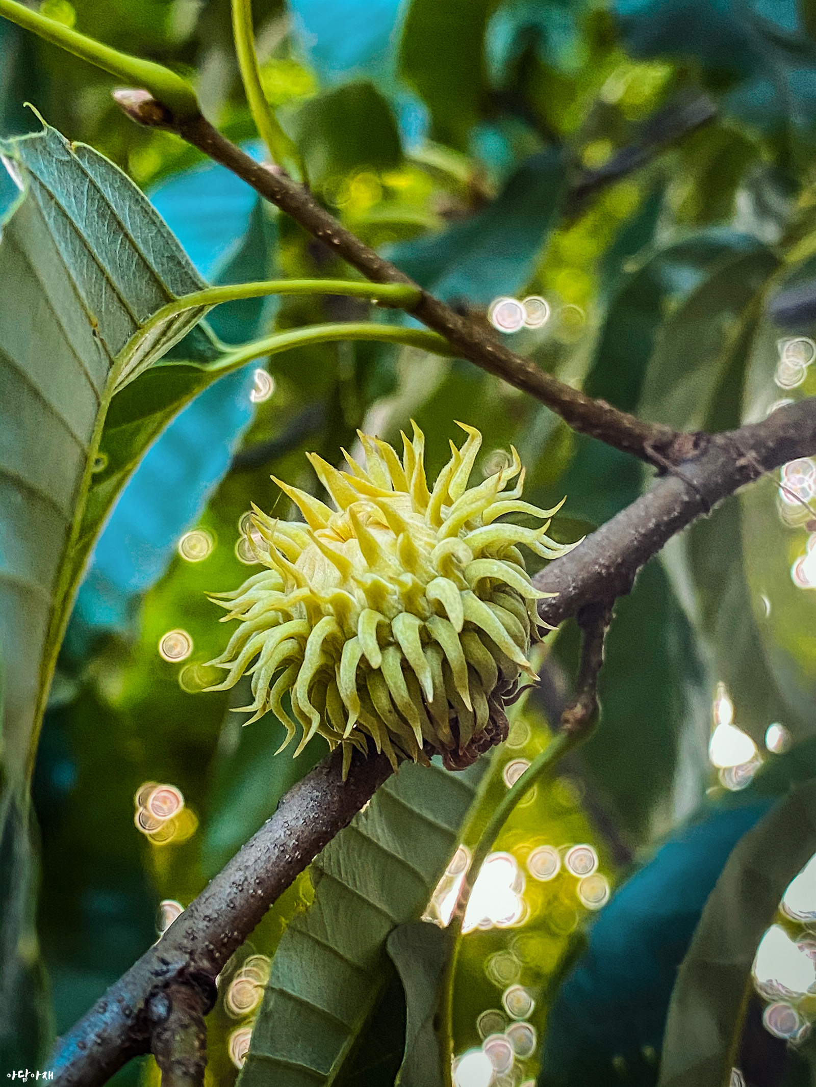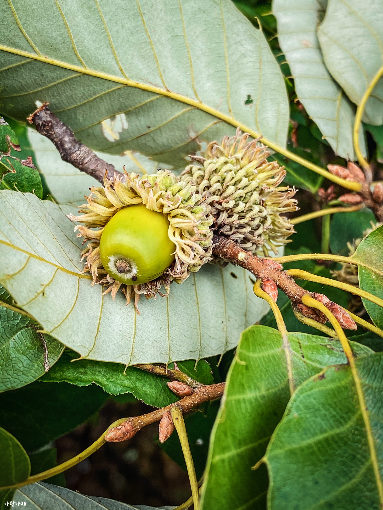 ▶ 굴참나무 열매: 견과, 구형, 뒤로 젖혀진 많은 긴 비늘잎으로 싸이고, 다음해 9월 초 ~ 10월에 성숙.