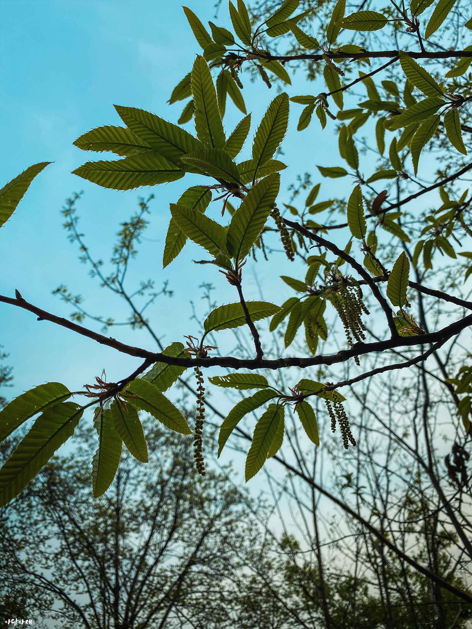 ▶ 굴참나무 꽃: 일가화(一家花)로 암수한그루, 5월에 잎과 더불어 피며; 수꽃차례 새가지 밑에서 처지고; 암꽃차례 위에서 곧추섬.